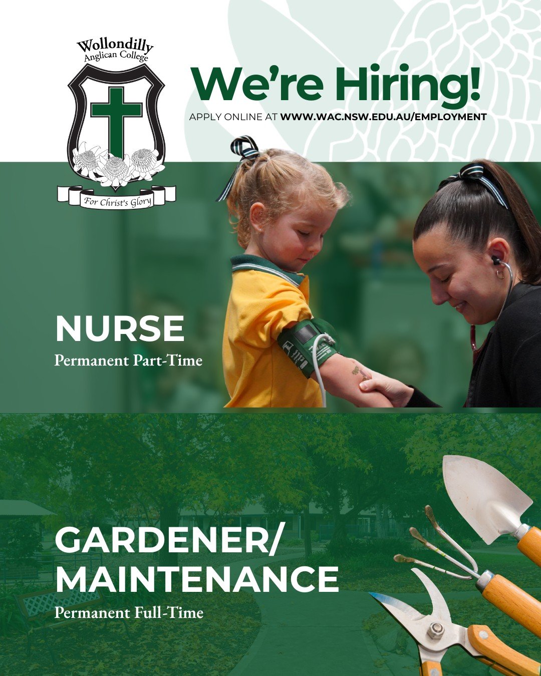 Please click on the link below and hand your completed application into the College Office with all supporting documentation, or scan and email it to employment@wac.nsw.edu.au or contact Geoff Adams at g.adams@wac.nsw.edu.au or via 02 4684 2577.